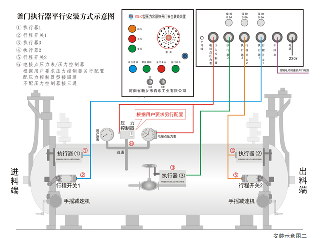 1.將主控箱安裝在便于觀察操作、防水防雨的地方,接通AC220V電源。將三通(壓力控制需配四通)安裝在進(jìn)料端釜門上部原壓力表處。