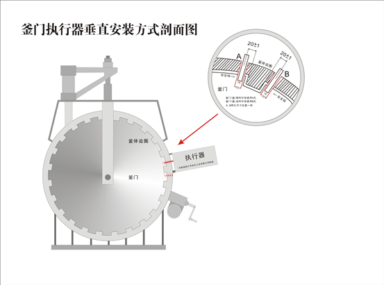 2.3.2.將壓力容器的快開門裝置關(guān)好,使其處于鎖緊閉合到位,確認(rèn)鎖緊及開啟方向,按《安全聯(lián)鎖裝置安裝圖》規(guī)定,在外齒圈鎖緊時的前進(jìn)方向,距殼體內(nèi)齒圈前端20±1mm在齒圈上畫安全銷孔橫中心線,兩點交叉處為銷孔圓心。